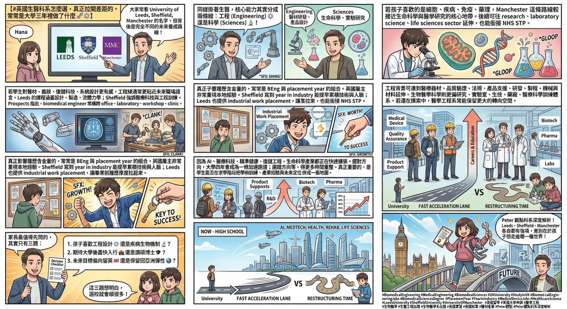 AI、醫療科技、精準健康、復健工程、生命科學產業都正在快速擴張,科系名稱相似,培養方向卻差一大截。Leeds、Sheffield、Manchester 各自都有強項,差別在於孩子想走進哪一種世界。
