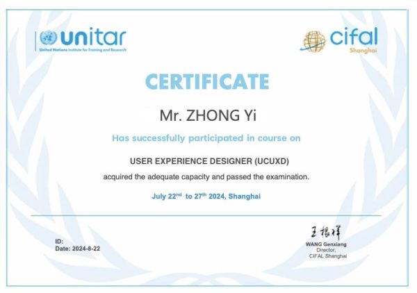 UCUXD使用者體驗設計師證書的頒布機構是聯合國訓練所CIFAL中心。聯合國訓練研究所(UNInstitute for Training and Research ),簡稱UNITAR,根據聯大1963年12月11日1934號(ⅩⅧ)決議成立於1965年,UNITAR為各國政府執行「聯合國2030年永續發展議程」提供支援。其主要使命是:為全球永續發展提供學習、分析和以能力為中心的解決方案,從而轉變思維模式,以應對複雜的全球性挑戰。為實現這一目標,聯合國訓練所在全球建立了CIFAL網絡,負責計畫在各國的具體落實實施。